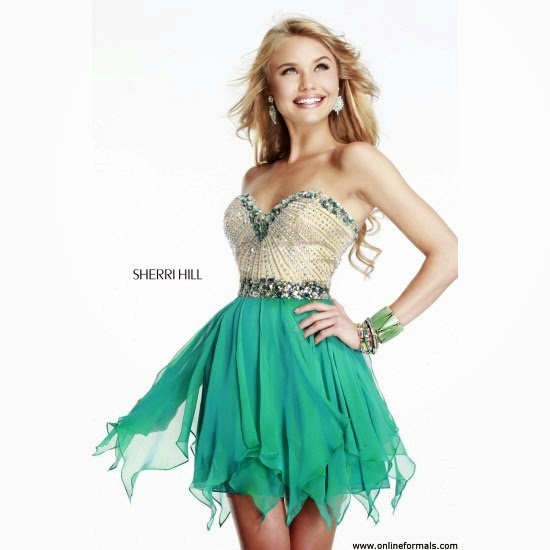 Sherri Hill 1928 is one of our top picks for Homecoming 2014! This short strapless dress features a beaded nude bodice and a handkerchief chiffon skirt. Very pretty and only $298--get yours